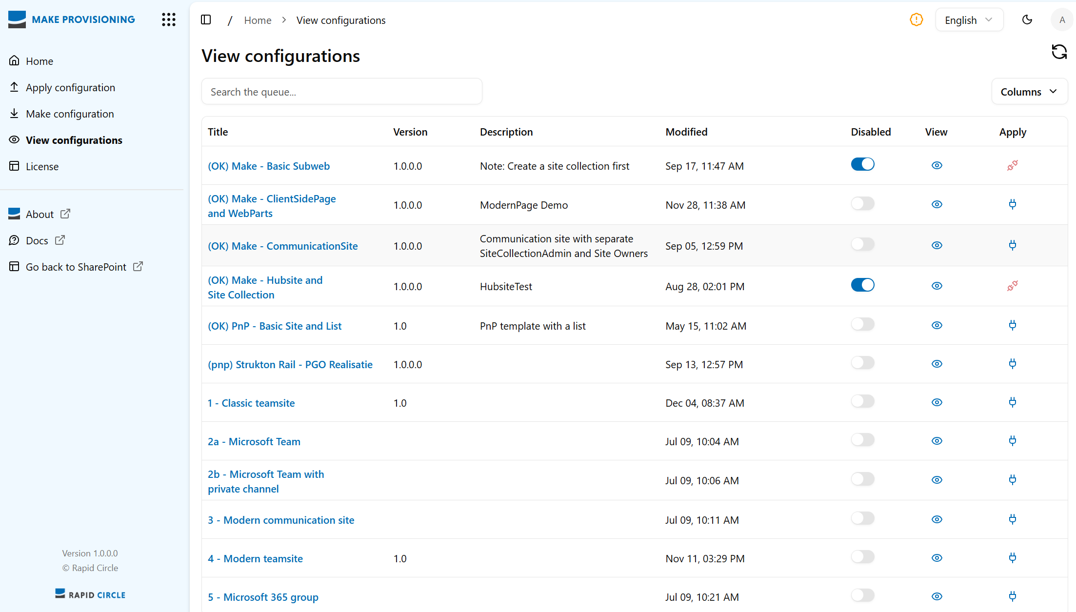 Search and Sort: You can search the collection using the search input field, and you can sort the configurations by pressing on the table headers of the corresponding columns.