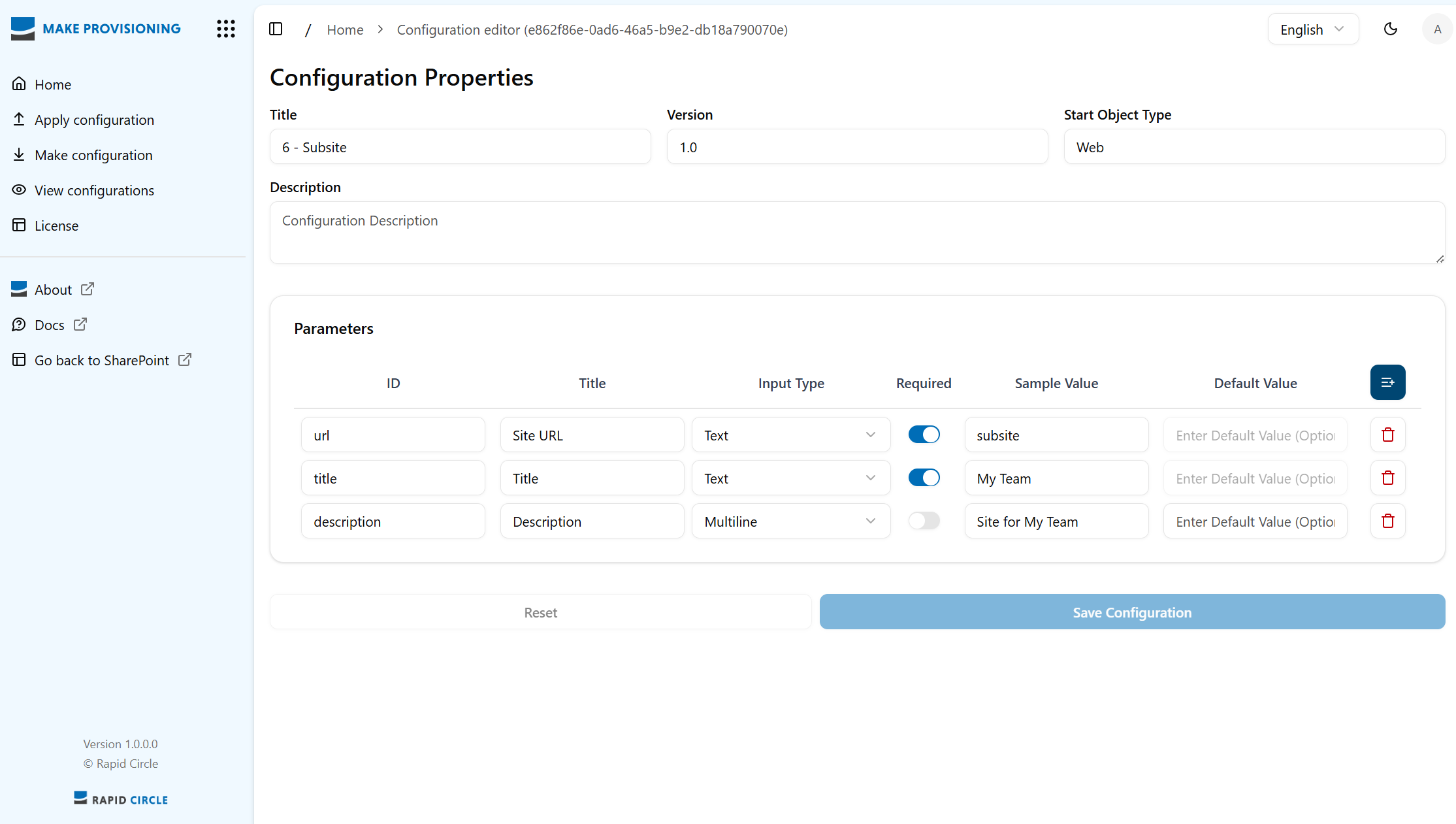 Manage in SharePoint: If you click on ‘Manage’, you will navigate to the same list within SharePoint. All changes to configuration properties made here can also be made directly in SharePoint.